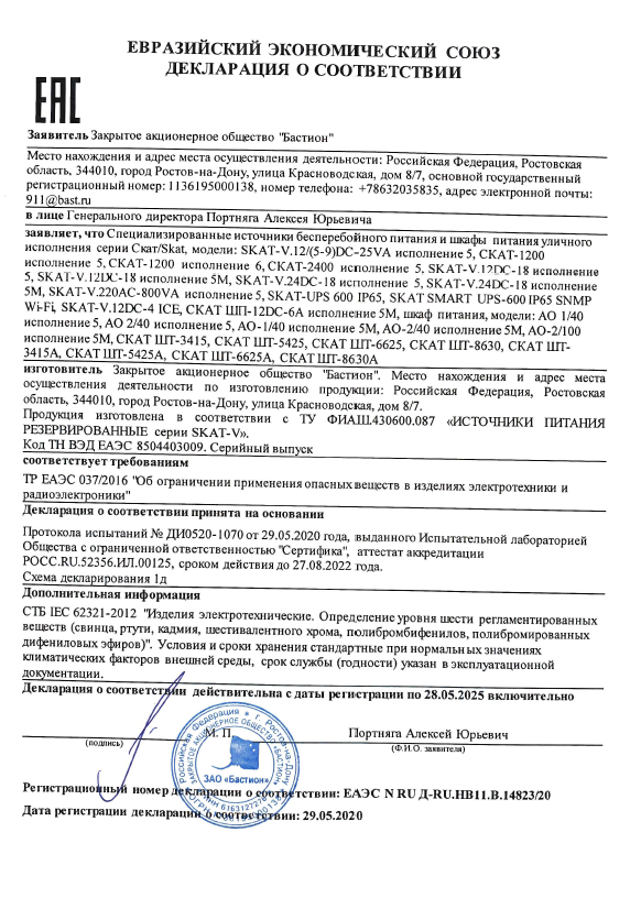 220 В, 600 ВА, On-Line, синусоидальная форма выходного напряжения, необходимое количество АКБ для работы — 2 шт., АКБ внешние, минимальная требуемая ёмкость от 40 Ач. Ток заряда АКБ — 7 А. Для размещения АКБ рекомендуется использовать отсек АО-2/100 исп.5М. Время резерва зависит только от емкости АКБ, допускается использование автомобильных АКБ. Защита АКБ от глубокого разряда. Металлический корпус уличного исполнения IP65, мембранные кабельные вводы, замки, кабели для подключения АКБ в комплекте. Внутренняя индикация режимов работы.