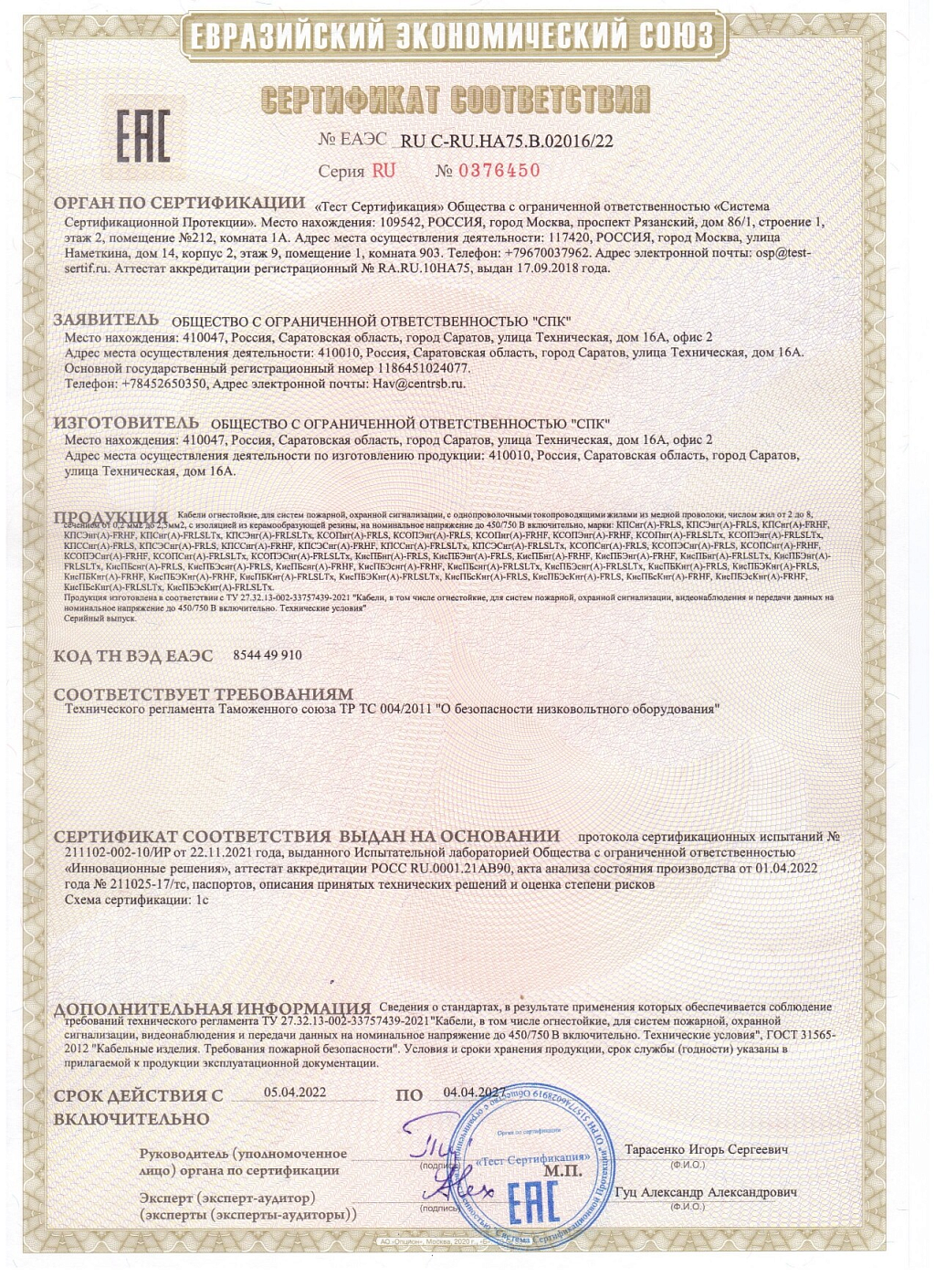 Кабели огнестойкие с медными однопроволочными жилами 1х2х0,5 кв мм, с изоляцией из кремнийорганической резины, с общим экраном из алюмолавсановой ленты и с контактным проводником из медной луженой проволоки, с оболочкой из ПВХ пластиката с пониженным газо- и дымовыделением и низкой токсичностью продуктов горения. Применяются в системах пожарной и охранной сигнализации (ОПС), системах оповещения и управления эвакуацией (СОУЭ) и передачи данных. Внешний D=5,85мм. Оболочка белого цвета.