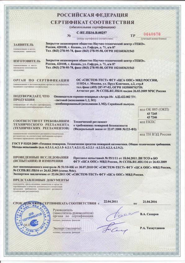 Сертификат соответствия Блок индикации Астра-863 исп.А Теко (лист 11)