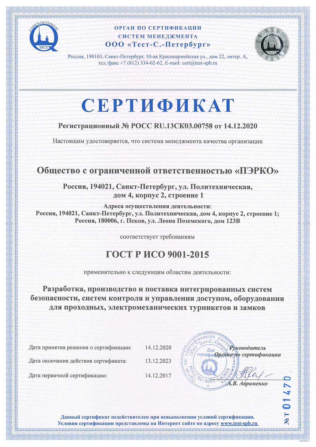 Сертификат качества Турникет ST-01 "Скоростной проход" для эксплуатации в закрытых помещениях (без створ PERCo